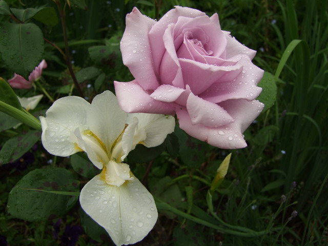 Campanula persicifolia samt sich bei mir reichlich aus, ergibt aber manchmal wunderschöne Kombinationen. Wie hier, als in einem Jahr nur blaue zwischen den verschiedenen weißen Rosen blühten.