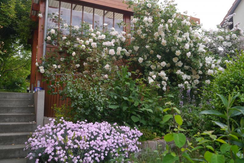 Auch früh, Ende Mai 2019, entstand dieses Foto, wo Nelken, Mme Alfred Carrière und Kolkwitzie (oben rechts) Ton in Ton blühen.