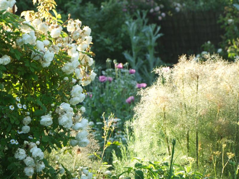 Ich habe noch so ein Morgenbild von Rambler 'Madeleine Selzer' die mit dem filigranen Laub vom Bronzefenchel korrespondiert.