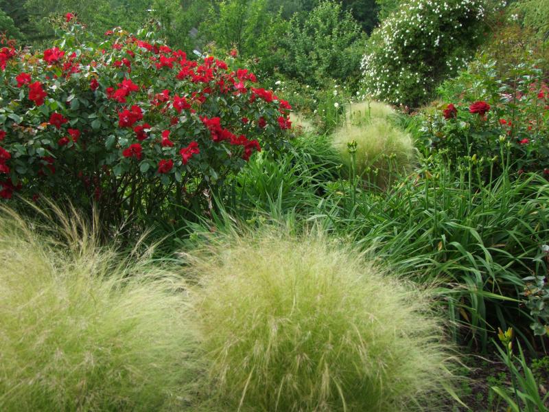 Wirklich dauerblühende Strauchrose 'Apache' von Kordes mit zarten Gräsern.Die Gräser mildern ein wenig die Farbwucht der roten Rose.