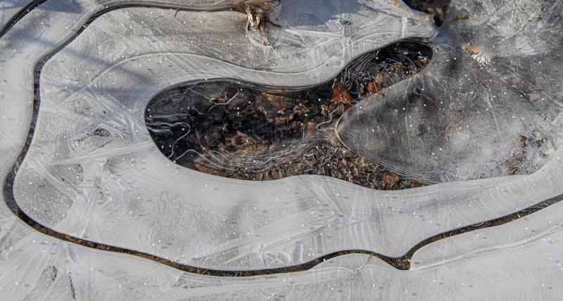 Schöner Kontrast zwischen dem Eis und den dunklen gefrorenen Traktorspuren.