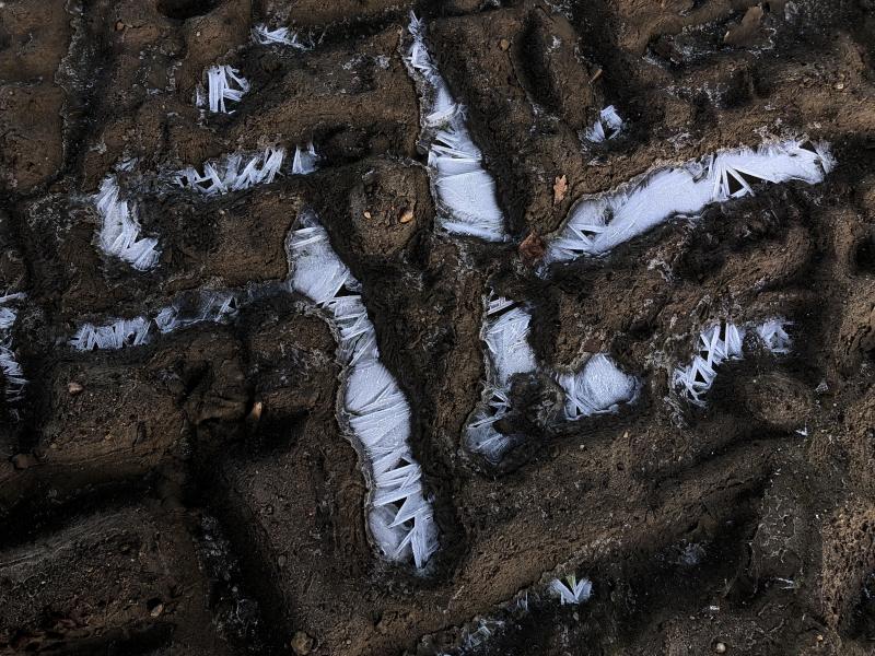 Schöner Kontrast zwischen dem Eis und den dunklen gefrorenen Traktorspuren.