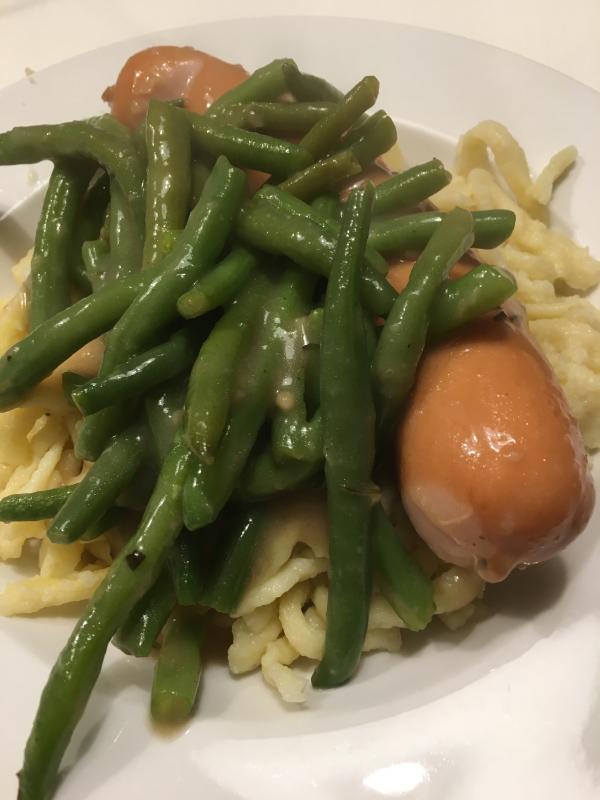 Gestern saure Bohnen, Spätzle, Knackwurst