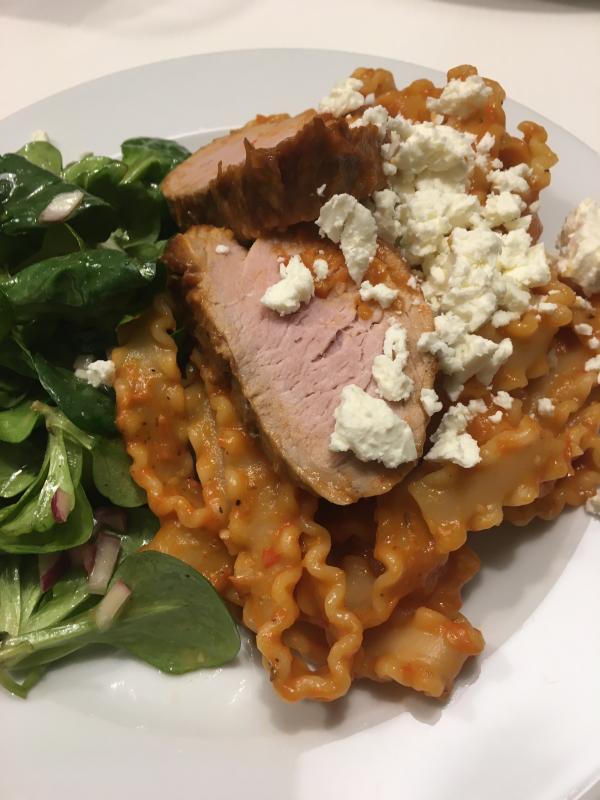Die letzten Gartentomaten und Auberginen aus dem Froster verkocht. Es gab also Nudeln mit Auberginentomatensoße, Schafskäsebrösel und Schweinefilet. Dazu Ackersalat