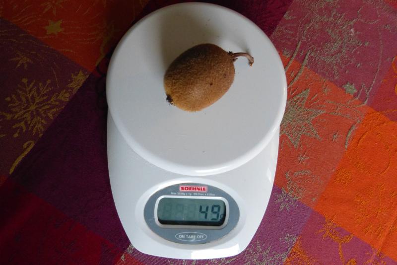 Gestern habe ich von einem befreundeten Kollegen Kiwis mitbekommen. Da der Strauch absolut alleine steht muß es sich um die Sorte Jenny handeln. Sie ist an der nach Süd-Süd-Ost ausgerichteten Hauswand hoch hinaus gewachsen und trägt jede Menge Früchte. Die Früchte sind gut 5x4 cm groß und wiegen zwischen knapp 40-50 Gramm. Sie sind ziemlich saftig mit angenehm süß-saurem Aroma (und besser als die meisten Supermarktkiwis).