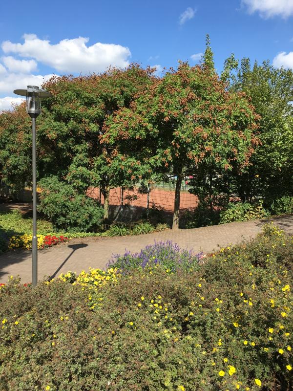 Die Koelreuteria vor dem Orangerie-Eingang das GRUGA-Parks in Essen haben ordentliche Obstbaumhochstammgrösse, da bleibt die Blumenesche wohl kleiner/braucht länger bis zu so einer Größe (es geht da bergab, ich steh zum fotografieren höher und ab der ersten geht auch nochmal ein Hang runter, dahinter ein Fußballplatz)