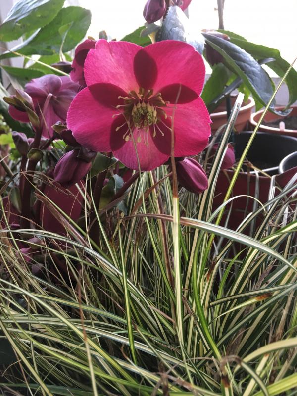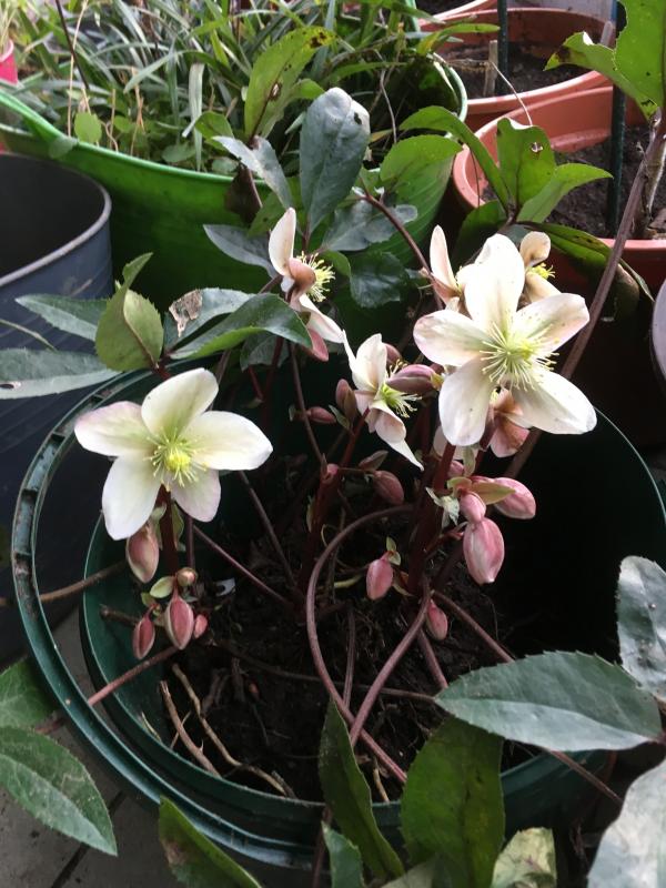 Meine Hellis sind alle noch in Pötten, Einern, Schüsseln o.ä. Die aus dem alten Garten stammen, hab ich erst vor kurzem ausgegraben. Die Sonne heute hat die Knospen geöffnet, so auch bei der Ice‘n Roses Red (das ist eine Gegenlicht-Aufnahme!)