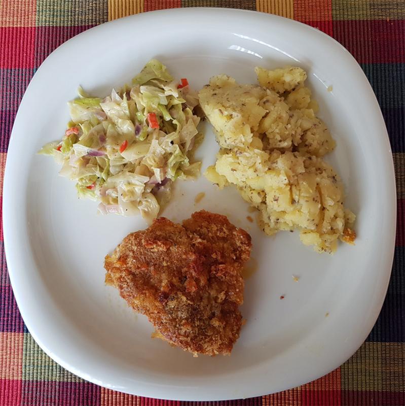 Heute gab es Vanille-Chily Spitzkohl, getrüffelten Kartoffelstampf und Kalbsschnitzel.