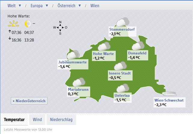 Wien/Mariabrunn ist dem Eistag entronnen ;) - "wärmster" Ort Wiens Wetterstationen um 13:00....der Dauernebel ist schuld.....