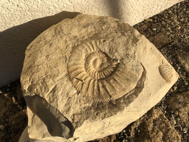 Diese Versteinerung kam beim Hausbau vor Jahren aus dem Boden. Es kamen noch mehr solche Sachen zum Vorschein, aber die waren vom Gestein her nicht winterhart und zerbröselten zu Matsch.