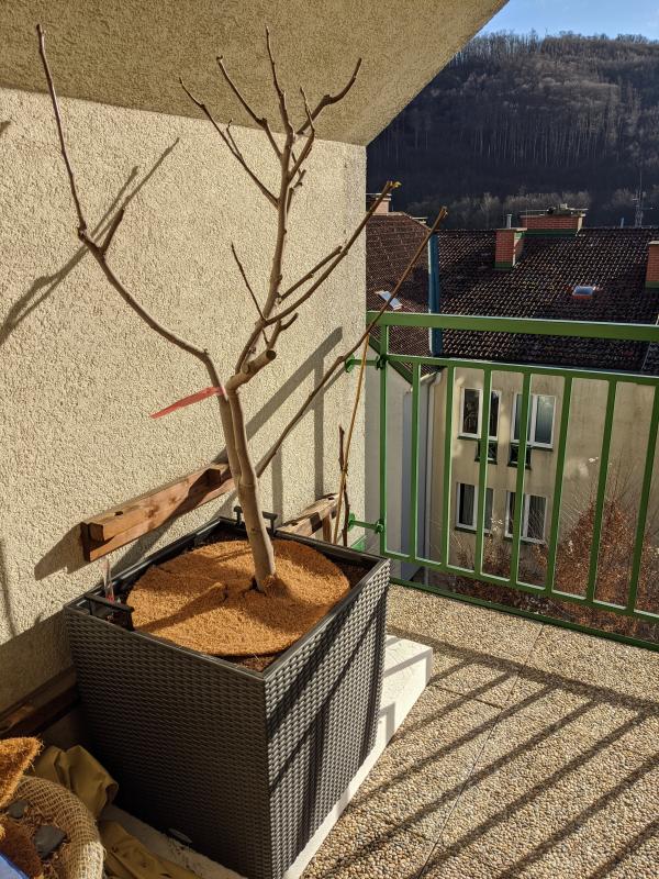 Da bereits 1 austreibendes Blatt zu sehen ist, muss ich wohl ab sofort den Fig-Shuffle spielen. Oder ich lasse einfach das Winterschutzvlies drauf wie aktuell, falls es Frost geben könnte.