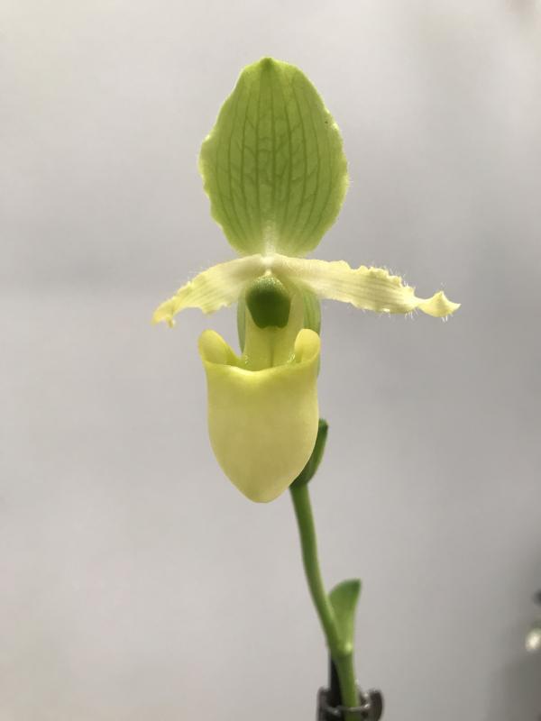 Eine entzückende Naturform, die zu einer besonderen Gruppe der Paphiopedilum gehört, den "Revolverblühern", die zwar mehrblütig sind aber bei denen sich die Blüten eine nach der anderen öffnen.