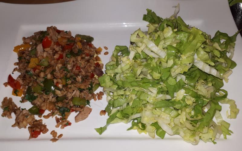 Bulgur (ganze Körner) mit Paprika, Zwiebeln, Thunfisch und Parmesan, Endivien