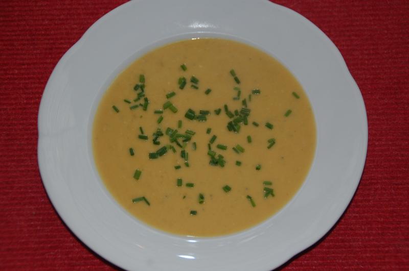 Blauschimmelkäse-Kürbis-Erbsen-Suppe (Gänseschmalz, Porree, Zwiebel, Möhre, Petersilienwurzel, Kürbis, Kartoffel, Erbsen, Salz, Blauschimmelkäse, Feta, Tabasco, Sahne, Schnittlauch)