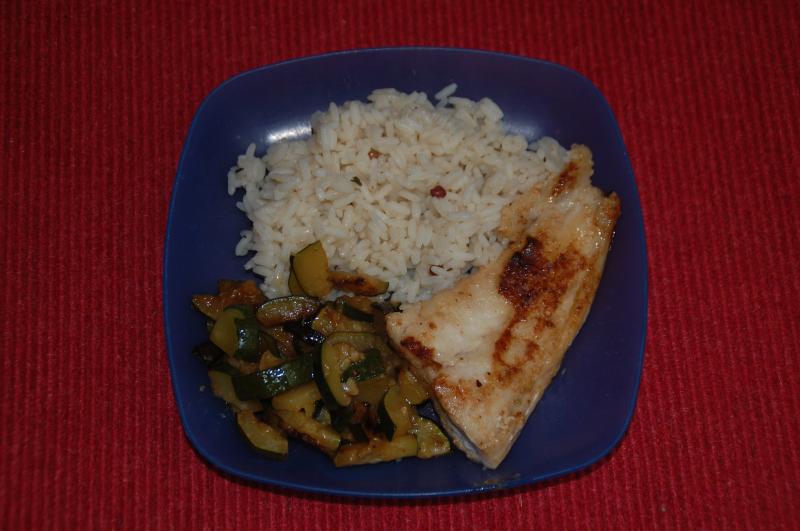 Reis (mit Thymian und rotem Pfeffer), Zucchini und Victoriaseebarsch (gebraten mit Meerrettich)