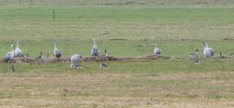 Heute war vielleicht etwas los auf den Wiesen hinterm Zweitgarten. Lange Zeit war große Kranich- und Gänseversammlung mit reichlich Trompeterei und Schnatterorchester. Später hielten sich nur noch zwei Kranichpaare dort auf, immer schön paarweise und dicht an dicht.