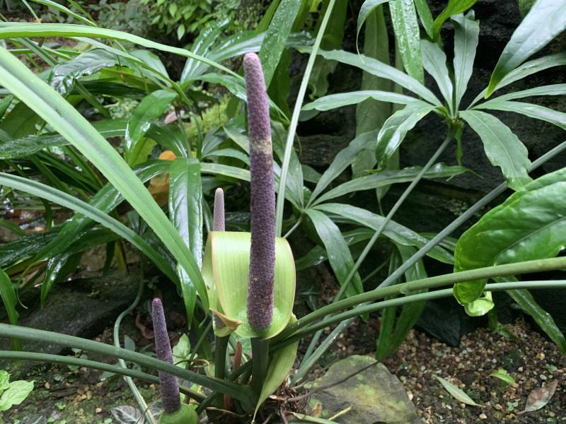 Das gestern erworbene Anthurium halte ich für A. ellipticum oder eine verwandte Hybride. Die Pflanzen erzeugen einen Trichter aus Blättern, in dem sich Laub sammelt und durch den Regenwasser zu den Wurzeln geleitet wird. Dasselbe Konzept wie beim Nestfarn (Asplenium nidus).