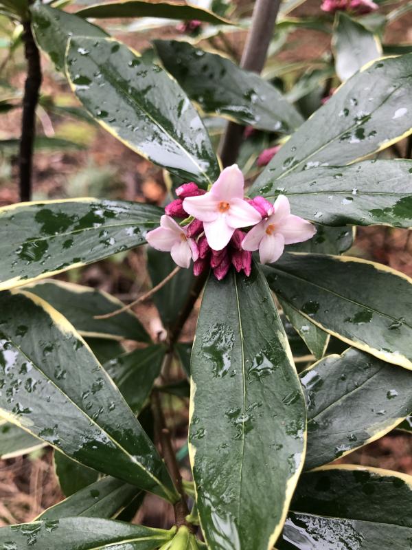 Besseres Fot, und inzwischen in Vollblüte, der ganze Garten duftet: Daphne odora.