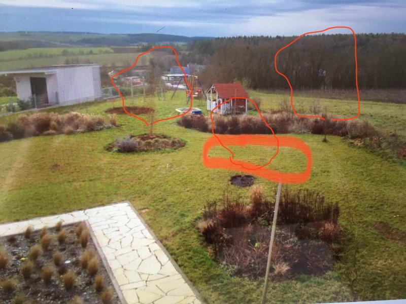 Bäume gibt es, ich habe mal im Bild eingezeichnet, welche Ausmaße da zu erwarten sind, links die salix yelverton, rechts die Blutbuche, davor mittig die neu gepflanzte zierkirsche. Wenn ich "vorspulen" könnte, würde ich fünf, sechs oder zehn Jahre machen, leider heißt es bis dahin warten. Aber immerhin die Weide wird ja schnell ihr Ding machen. Die Zierkirsche soll innerhalb des umliegenden Beetes liegen.