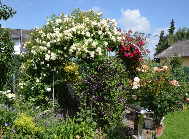 'Lykkefund' wirst du aber nicht so niedrig halten können. Jasmina kann ich mir auch nicht so gut zur Ghislaine vorstellen, rosa aber schon. Ich habe 'Climbing Alberich' und 'Narrow Water' mit ihr am Pavillon. Letztere ist hier noch zu klein, daher auf dem Bild nicht zu erkennen.