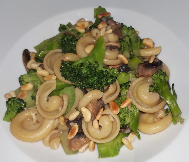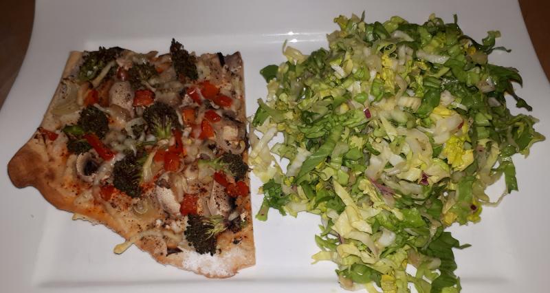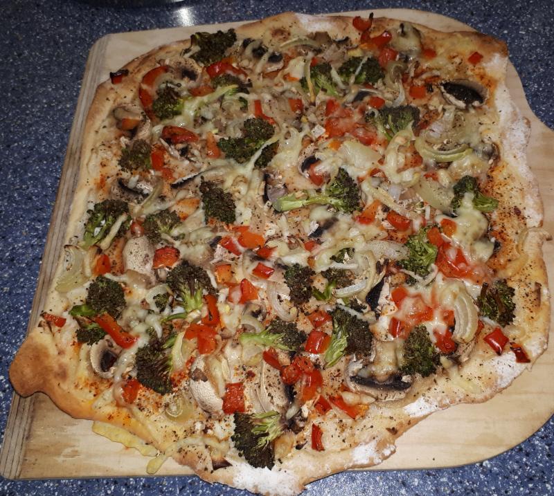 Heute hatten wir Flammkuchen mit Champignons, Brokkoli, Paprika und Zwiebeln