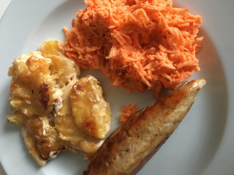 Gestern Puteninnenfilet, Kartoffelgratin, Karottensalat