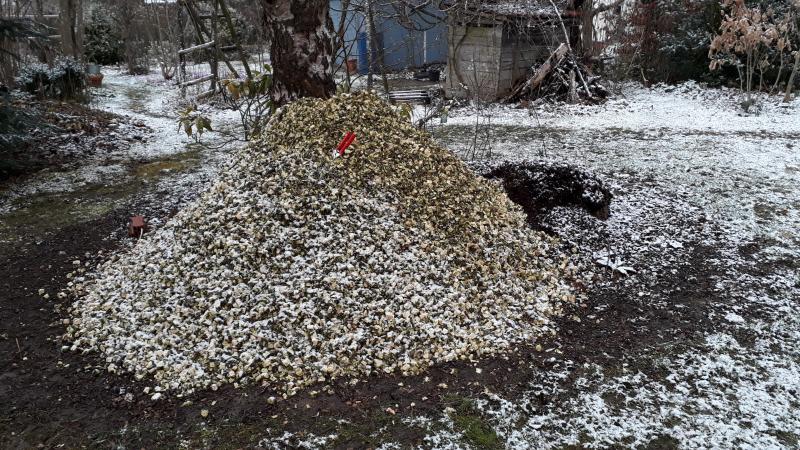 Ich habe den Rasen von den Hinterlassenschaften des letzten Sturms befreit. Dann Cyclamen an schönere Plätze verpflanzt und einen dicken Helleborus-Horst umgesetzt. Die Fläche war noch voll besetzt mit eingeschlagenen Pflanzen, aber die sind jetzt umgeogen. Nun kann es endlich losgehen mit dem neuen Obst-/ Gemüsegartenteil. Obstbäume sind schon gepflanzt, und nun kommen die Beerensträucher dran. Die Fläche fürs Gemüse hatte ich schon im Herbst umgegraben und dick mit Laubmulch abgestreut. Fehlt nur noch gutes Wetter. Zur Zeit ist es fisselig und kalt.