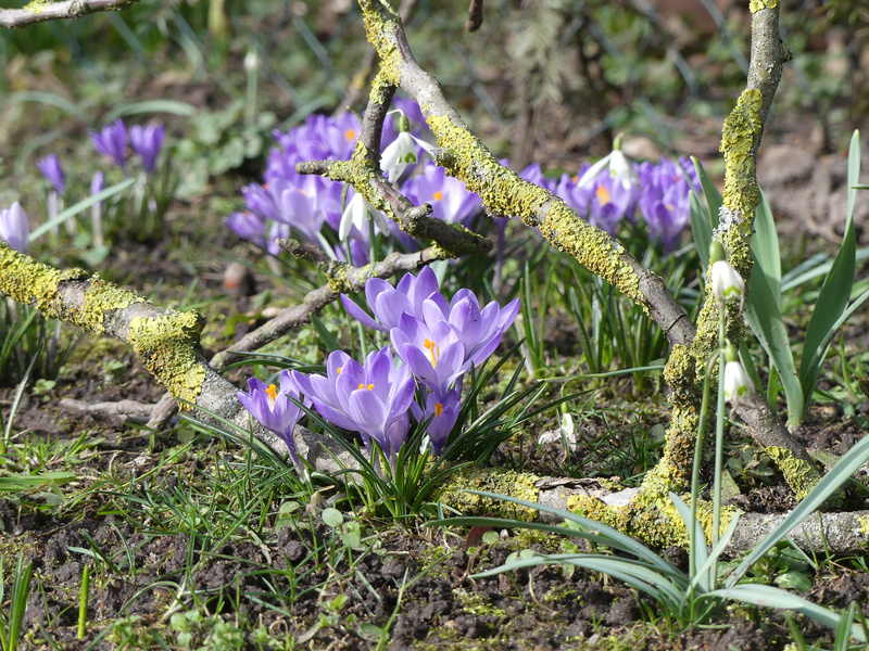 Hochbetrieb an der Nektar- und Pollentankstelle! Die Krokusse blühen dieses Jahr ausgesprochen üppig, leider macht ihnen das unbeständige Wetter zu schaffen. Das Lungenkraut kam letztes Jahr als "blinder Passagier" in einem Schneeglöckchentopf von pearl zu mir, unterm Fächerahorn im Halbschatten gefällt es ihm offenbar gut.