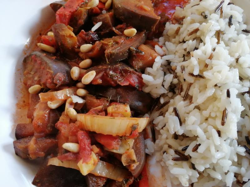 Schmorgemüse (Auberginen, Paprika, Fenchel, Tomaten, Zwiebeln, Knoblauch, Chili) mit Reis