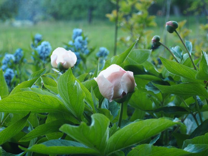 und Paeonia Wittmanniana 'Mai Fleuri' vor Amsonia tabernaemontana subsp. salicifolia [Anja Oudolf]