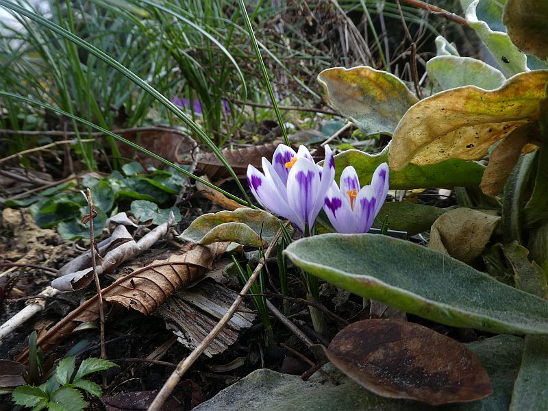 Die zarten Krokusse wie tommasianius und sieberii sind hier großteils im Regen umgefallen und nicht vorzeigbar. Die dicken Crocus vernus sind stabiler und beginnen jetzt mit der Blüte. z.B. 'Jeanne d'Arc'