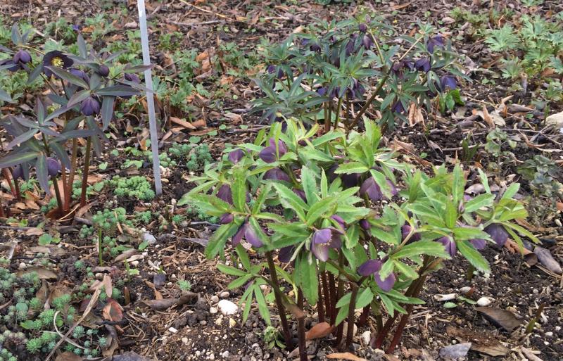 Hier blühen H. atrorubens, die genetische Bandbreite ist faszinierend. Die hintere linke Pflanze treibt sehr dunkel aus, die vordere eher grün.