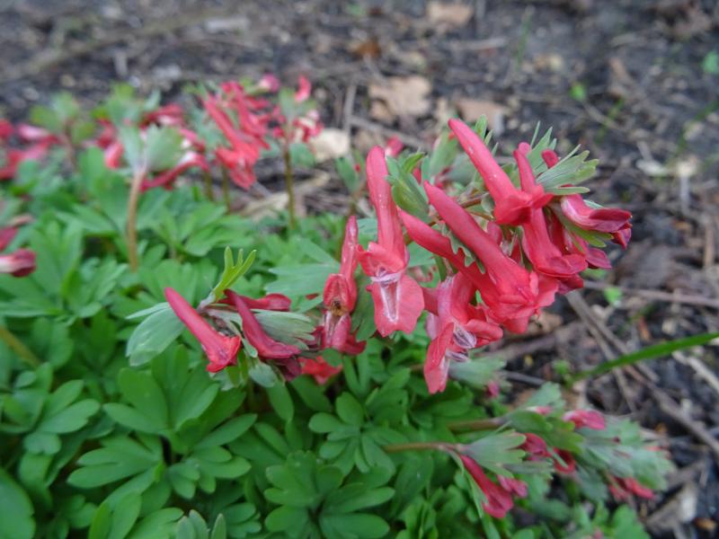 Die allerersten roten Corydalis solida sind unterwegs. Interessant ist, dass die weißen Formen früher zu sein scheinen, die hier erstmals blühen. Ganz weiße hat Norna mir im letzten Jahr geschickt. Irm hat mir die mit zartem rosa Hauch mitgebracht (neben einem ebenfalls rosa überhauchten C. malkensis, der kurz vor der Blüte steht). Danke Euch beiden!!