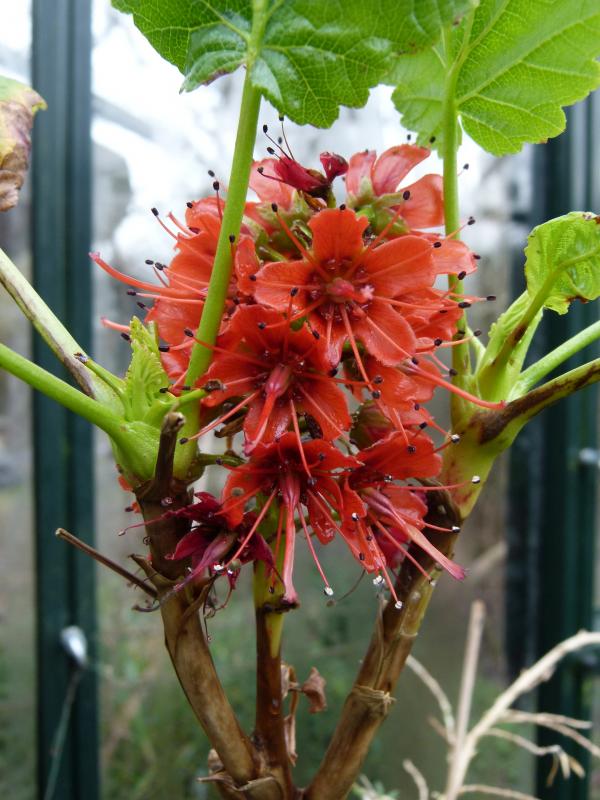 Ein erster, noch sehr kleiner Blütenstand an einem Neuzugang vom letzten Jahr: Greyia sutherlandii.