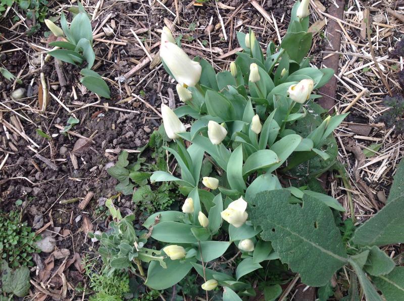 Einige meiner Beete mit Tulpen hatte ich hier schon gezeigt, doch in einem Beet, das 2014 mit Tulpen, Stauden und Gehölzen neu bepflanzt wurde, sind die meisten Tulpen ausgefallen. Nur die Purissima ist noch vorhanden; von den anderen Sorten meist nur die pflatschigen Blätter (Tulpenfeuer?) und ganz wenige Blüten.