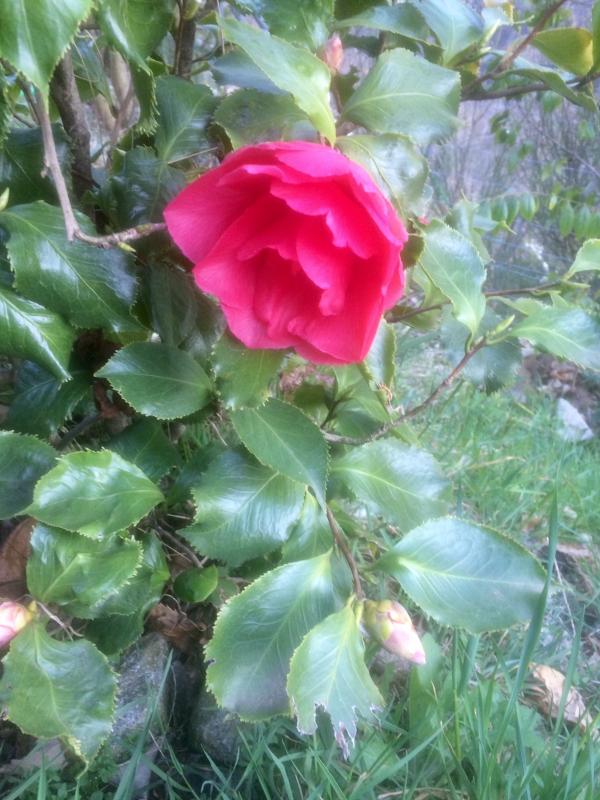 Wenn fünf unvernünftig eng gesetzte Kamelien eine Hecke sind, blüht 'Jingle Bell' dort gerade wunderschön. Lässt sich aber noch nicht gut im Ganzen fotografieren, daher nur zwei Blütenfotos. ;)