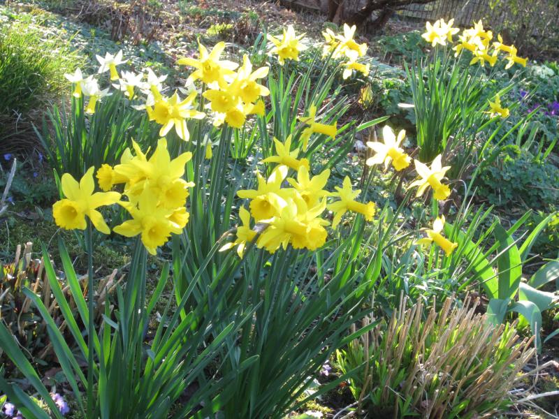 Hier blüht Omphalodes verna (hauptsächlich unter Rhododendron) immer ein klein wenig früher als Brunnera und breitet sich flächig aus. Sogar einige Pachysandra, die dort früher mal standen, wurden überwachsen, Martina.