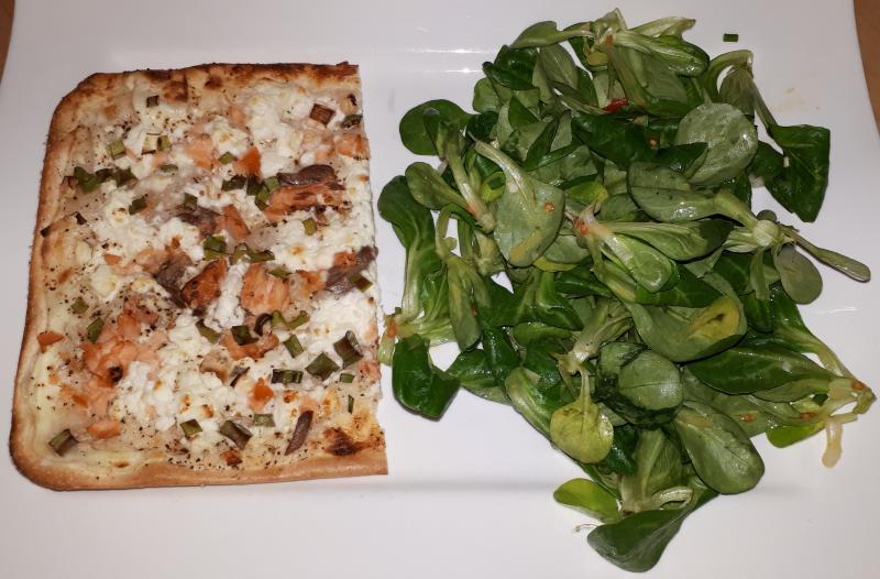 Heute gab's Flammkuchen mit Lachs, Lauchzwiebeln und Schafskäse, dazu Feldsalat mit Tomaten.