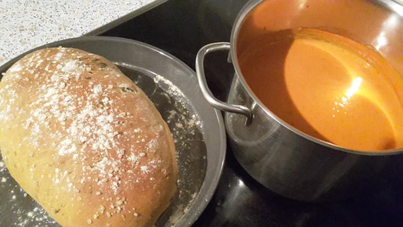 Hier gab es Paprikacremesuppe mit selbstgebackenem Bärlauchbrot :D