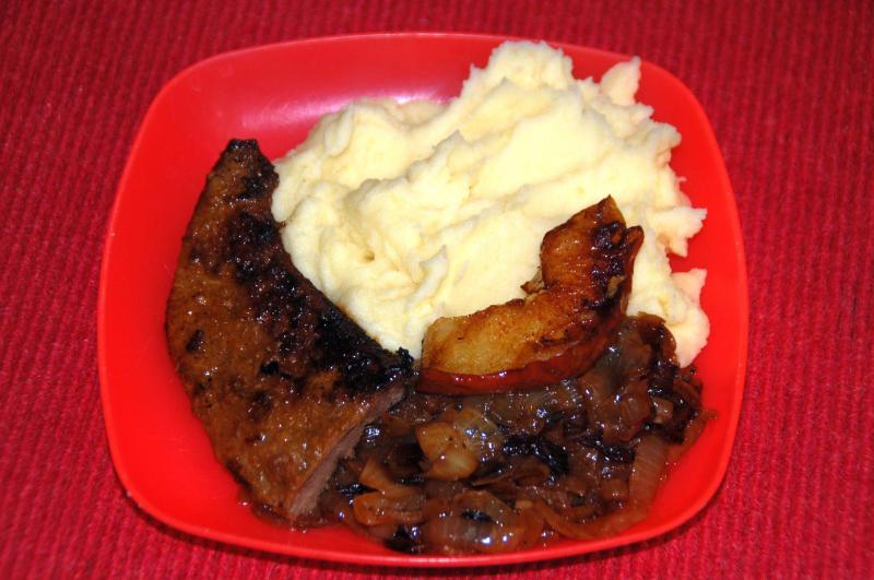 Auf dem Markt bekam ich Leber (das eine Taki sprach es eher als "Lee-Bär" aus ...). Also gab es heute Leber Berliner Art; mit Kartoffelbrei (+ Muskat und laktosefreier Milch), Zwiebeln und Apfelscheibe.