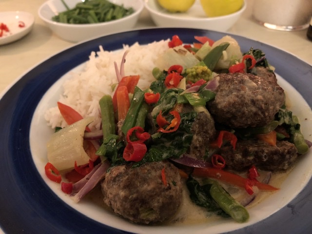 hier grünes thai-curry mit rindfleischbuletten (gewürzt u.a. mit gemörsertem zitronengras, knoblauch und gartenchili)