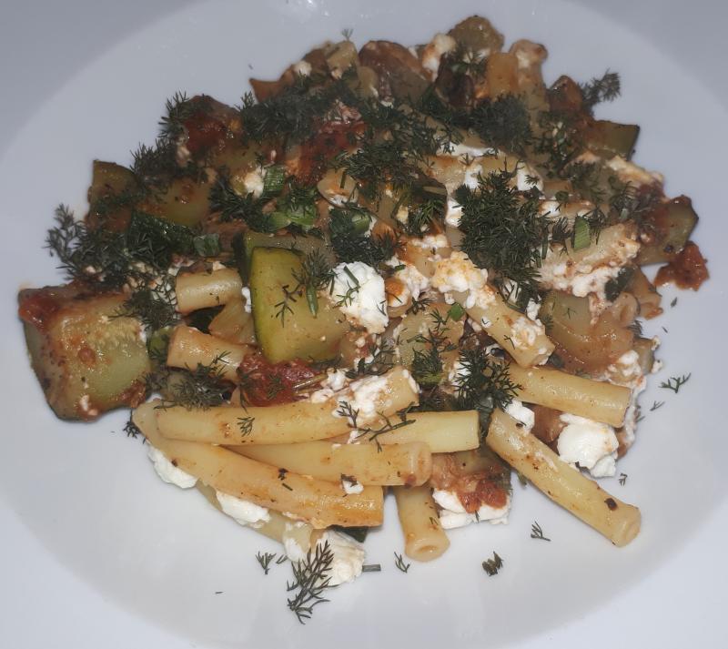 Maccheroni mit Champignons, Zucchini, Tomaten, Lauchzqiebeln und Schafskäse, dazu Gurkensalat
