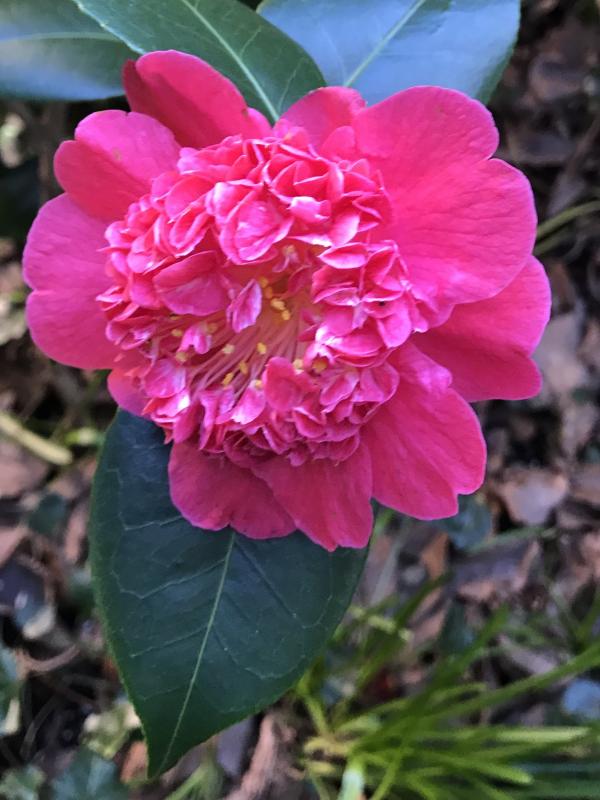 Wenn fünf unvernünftig eng gesetzte Kamelien eine Hecke sind, blüht 'Jingle Bell' dort gerade wunderschön. Lässt sich aber noch nicht gut im Ganzen fotografieren, daher nur zwei Blütenfotos. ;)