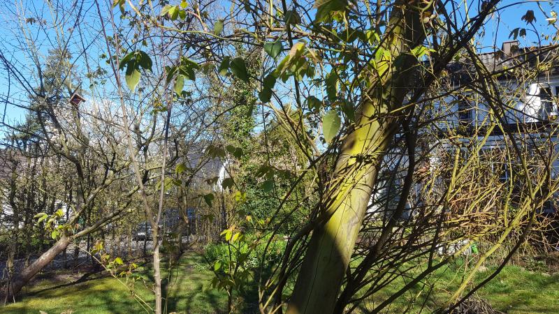Blick durch dichtes Rosengestrüpp ( Mme Alfred Carrier ) Richtung Nachbars Magnolie, im Hintergrund zu erahnen