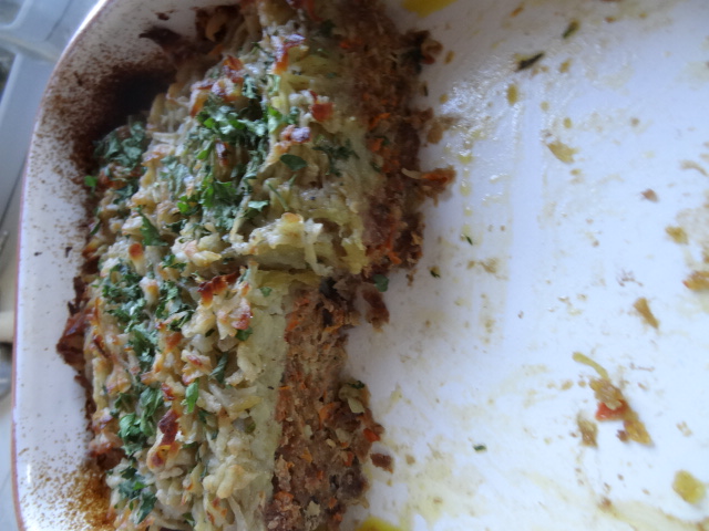 Gestern habe ich mal nach Rezept gekocht: Potthucke mit Blumenkohl, rohen und gekochten Kartoffeln, Zwiebeln, Schmand, Ei und Käse, dazu Postelein mit Tomaten