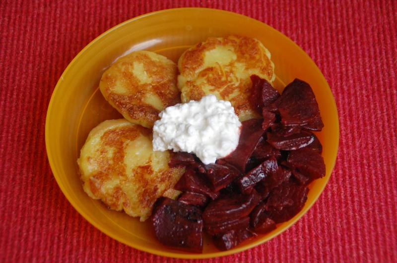 gebratener Kloßteig mit roter Bete (Bete, Butter, Gemüsebrühe, Sahne, Pfeffer) und Krümelquark