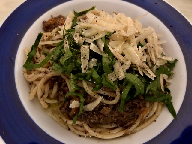 bei uns gab es endlich mal tk-reste: spaghetti mit brasato di manzo, darüber gartenbärlauch und parmigiano geworfen