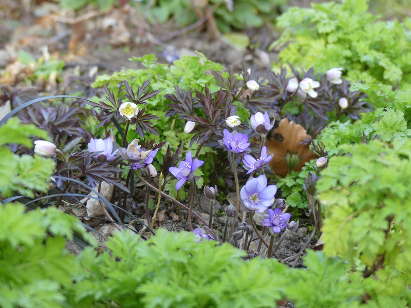 Nochmal Asarum, Anemone blau + weiß, Leberblümchen rosa + rot