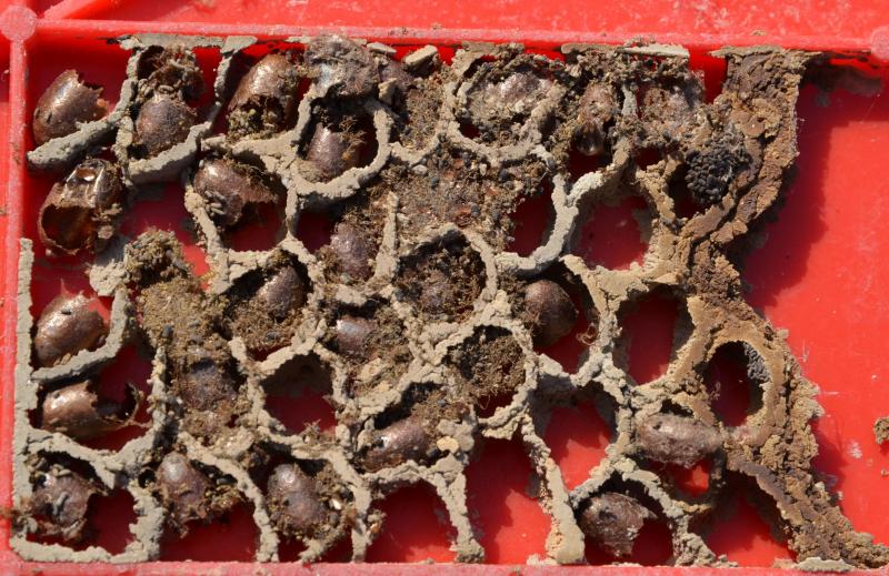 @enaira: Das sieht sehr nach Mauerbiene aus. Die braunen Hüllen sind die Kokons, aus denen die Bienen geschlüpft sind, der Kot ist das, was die Larve während ihrem Wachstum abgibt. Normalerweise bauen sie in einer Reihe hintereinander, aber ich habe schon gelesen, daß es auch unordentliche freie Bauten gibt.