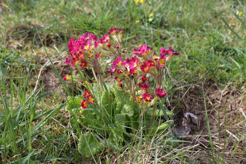 Oben am Hang in Waldrandnähe wachsen viele Elatior und es vermischen sich viele mit gepflanzten Topfprimeln und ihren Nachkommen.